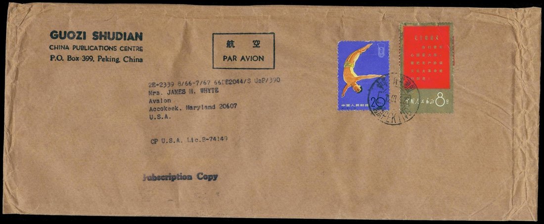 1967 (25 Jun.)"Guozi Shudian" printed-matter envelope, enclosed with Peking Review Issue 26 (issued on 23.6), from Beijing to U.S.A, bearing Long Live Invincible Chairman Mao's Thoughts (W1) 8f. and 2nd National Games (C116) 20f., fine. Yang C377, W11. Photo