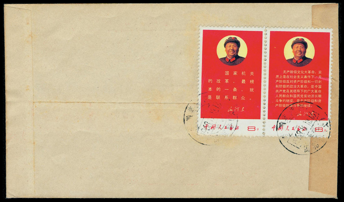 1968 (18 Aug.) printed "Mao's Thought" envelope from Wuhu to Shanghai bearing on reverse Instruction from Chairman Mao (W10) 8f. (2), cancelled by native c.d.s. Yang W58-59. Photo