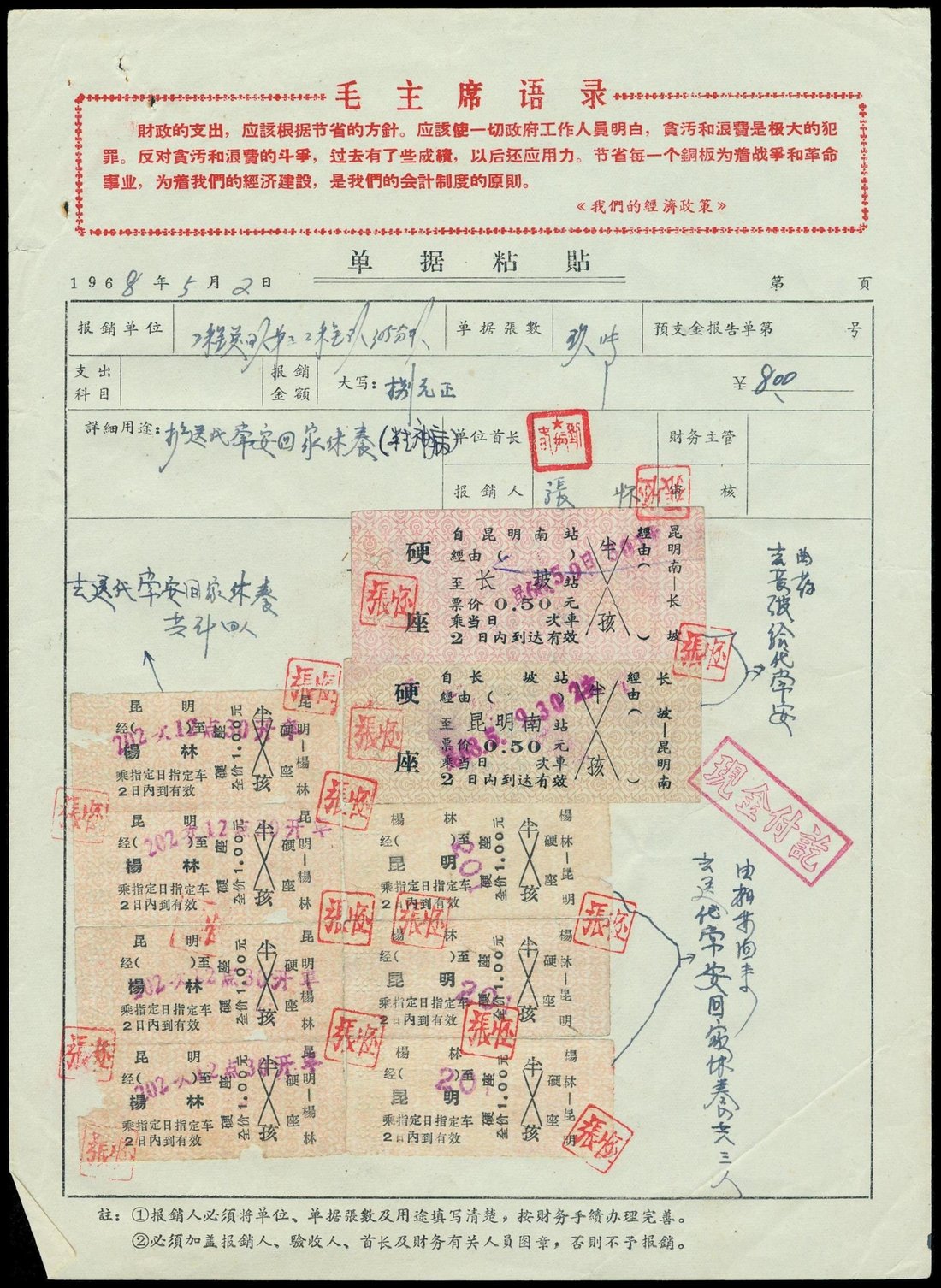1968 (2 May) voucher with Chairman Mao's economic policy printed, with batches of train tickets affixed on for reimbursement of $8, "Cash paid" framed h.s. in red tied. Photo