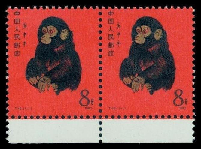 1980 Year of the Monkey (T46) 8f. horizontal pair with sheet margin at foot, unmounted mint, good gold colour, usual offset on reverse, very fine. Yang T234. Photo