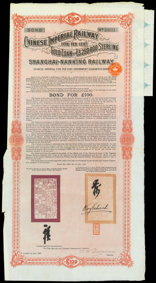 1903 5% Shanghai-Nanking Railway Gold Loan, bond for ?100, 1907 issue, large format, red and black, with coupons, very fine, rare.