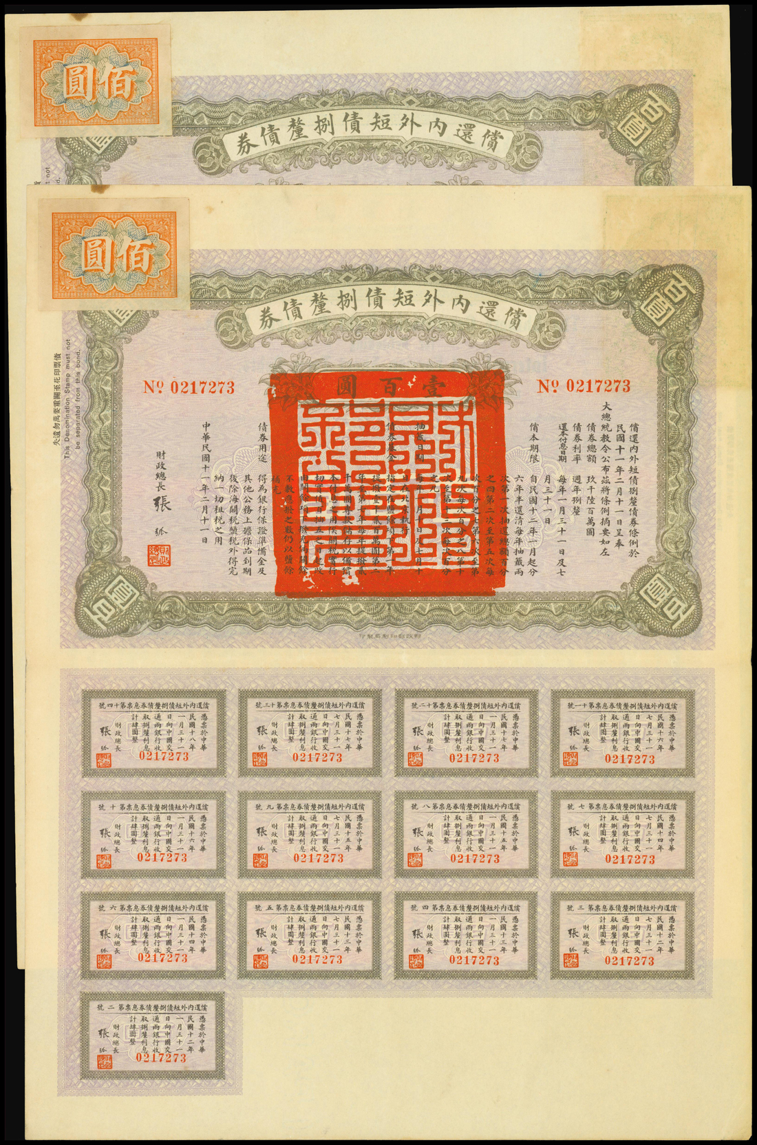 Chinese Government 8% bonds for Refunding Internal and Foreign Short Term Debts, a consecutive pair of bond for 100 dollars, 1922, number 217273 to 217274, ornate border, green and black on pale violet underprint, large red chop, adhesive orange denomination stamp top left corner, reverse blue on orange underprint, adhesive green denomination stamp, with complete coupons, stains, foxing, extremely fine.(2)