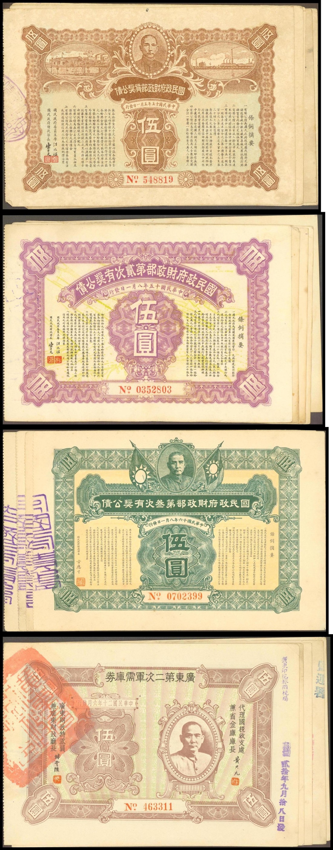 Mixed lot of 1926 15th Year Nationalist Government Lottery Loan, 5 dollars(5), 1926 Second Nationalist Government Lottery Loan, 5 dollars(5),1927 Third Nationalist Government Lottery Loan, 5 dollars(5) and 1931 Kwangtung Second Army Supply Loan, 5 yuan(5), all small format, generally very fine.(20)