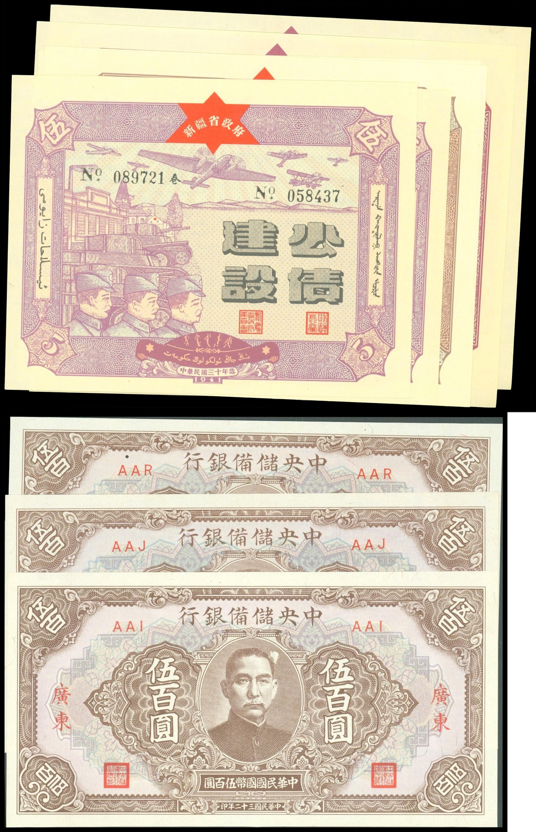 Central Reserve Bank of China a lot of 3 banknotes and 6 bonds, 3x 500yuan, 1943, Kwangtung, block serial number AAI, AAJ and AAR, brown and pink, Sun Yat Sen at centre, (Pick J24c), uncirculated, also Sinkiang Province, Construction Loan, 1941, 2 each of 5yuan, 10yuan and 25yuan,