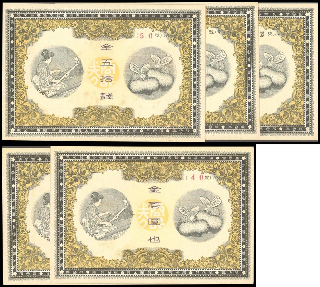 Japan, a lot of 5 coupons, 50 sen, 1 yen, 2 yen, 3 yen and 5 yen, no date, black and yellow, weaving woman at left, moths at right, issued by a tailor shop for the convenience of their customers, most of them with revenue stamps on reverse, generally uncirculated.(5)