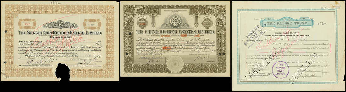 Rubber Companies in South East Asia, group of 3 share certificates, The Cheng Rubber Estates Ltd, The Sungei Duri Rubber Estate Lts and The Rubber Trust,
