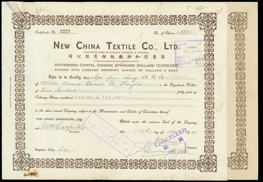 New China Textile Co., Ltd., 2 certificates of $5 shares, 1940 and 1941, number 3940 and 7277, ornate border, brown on white paper, text in English, Chinese company name, repaired and clip rusted, very fine to extremely fine,(2). Sold as is, no return.