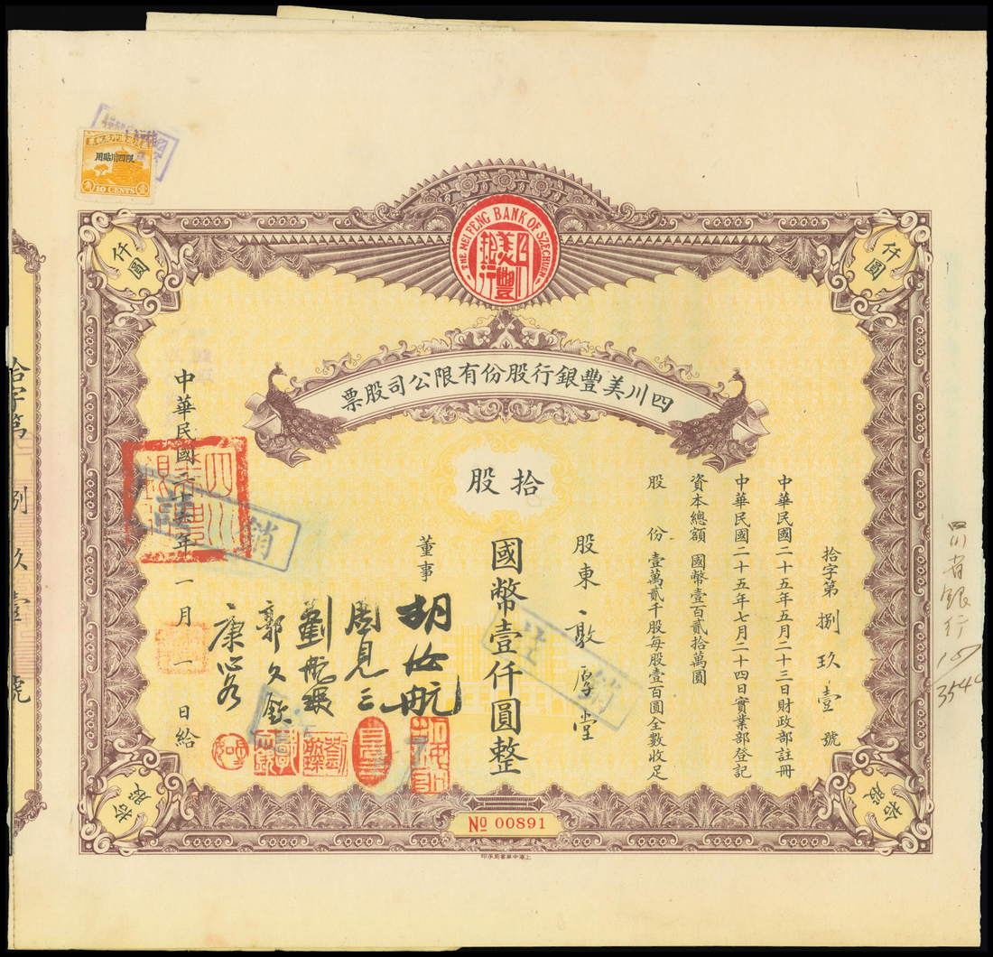 Mei Feng Bank of Szechuan (American Oriental Bank of Szechuan), 10 shares of 100 yuan, 1937, number 891, ornate border, brown, red and black, yellow underprint, text all in Chinese with Chinese name in English at the top, adhesive revenue stamp, with counterfoil and coupons, good very fine.
