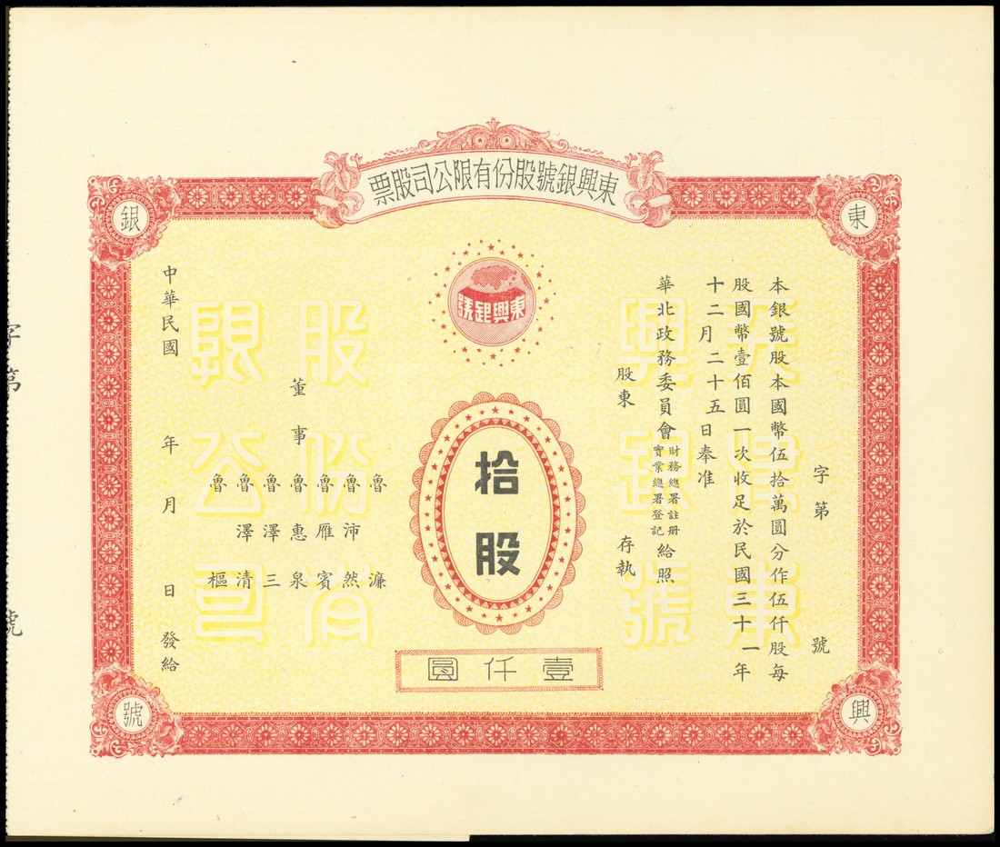 Dong Xing Bank Ltd, unissued certificate for 10 shares at 1000 yuan, ND(1942), red on yellow underprint, ornate border, red logo at top centre, all text in Chinese, attached with counterfoil, about uncirculated to uncirculated.