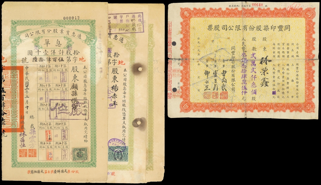 Tung Fung Printing and Dye Co., Ltd., certificate for 22300 shares of 150 Yuan, 1955, ornate border, red on yellow underprint, heavy folded, repaired, good fine, together with 3 dividend receipts of Tung Wei Enterprise Co., Ltd., all with revenue stamps, fine to very fine.(4)