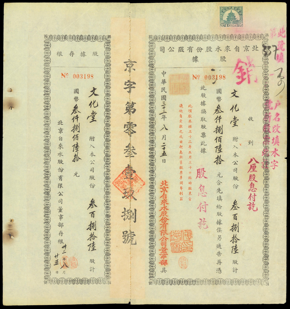 Peking Water Supply Co., Ltd., receipt of shares, 1943, ornate border, black on white paper, red chops, with a revenue stamp at top, attached with counterfoil, very fine. Sold as is, no return.