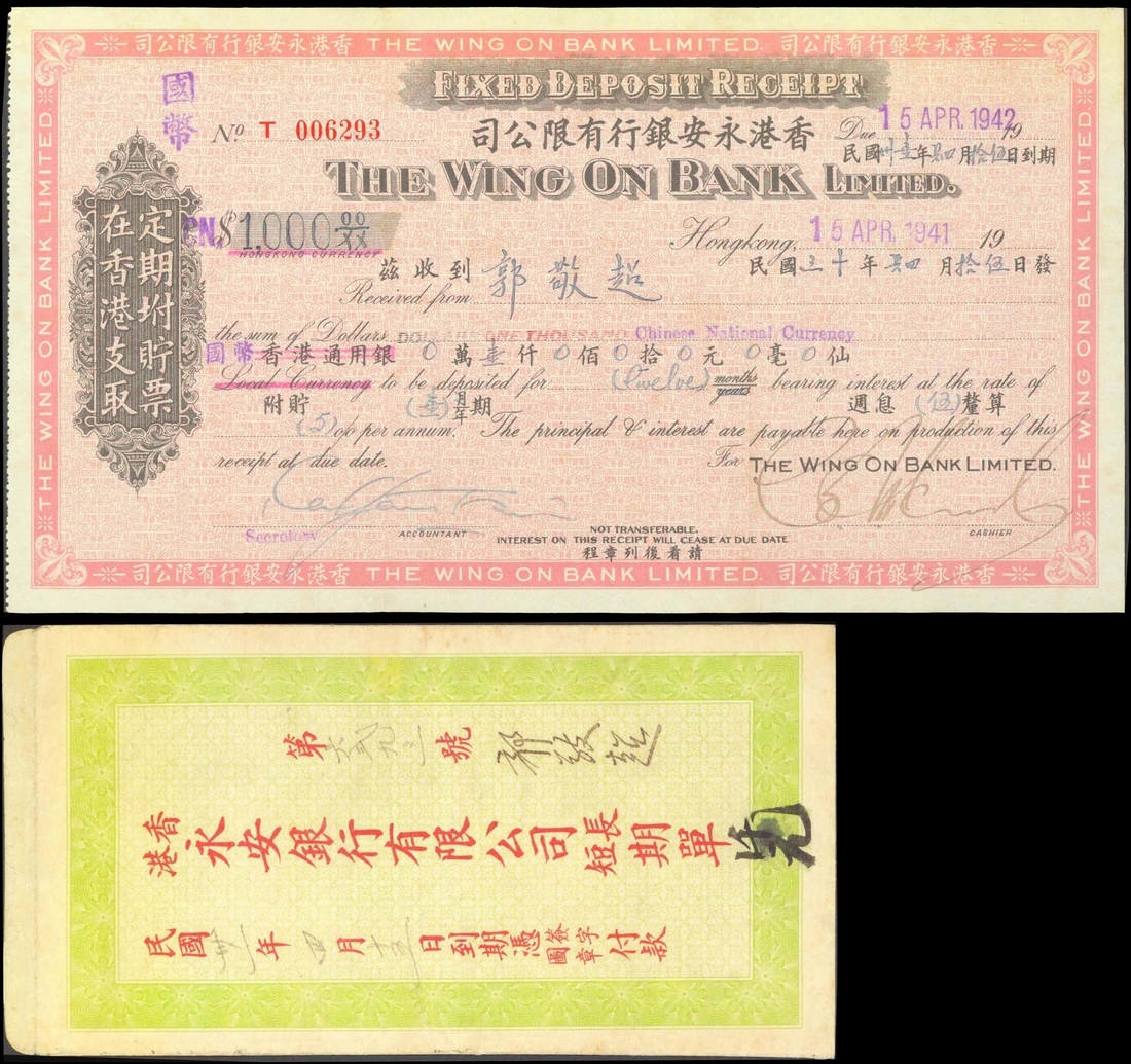 Hong Kong, Wing On Bank Limited, fixed deposit receipt, CN$1000, 1941, serial number T006293, black on pink underprint, handsigned signatures at bottom left and right, reverse black Chinese text, with original envelope, good extremely fine.