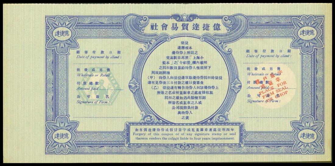 Isida Trade Association, Shanghai, $1 unissued coupon, series 05477, number 21, blue on light green underprint, English text on light green Company logo, reverse blue on pale green underprint, text in Chinese,
