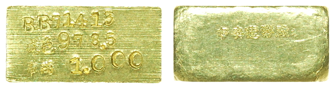 Republican era, Central Mint, 1 tael gold nugget, square shape, inscribed serial number BB71413, about uncirculated.