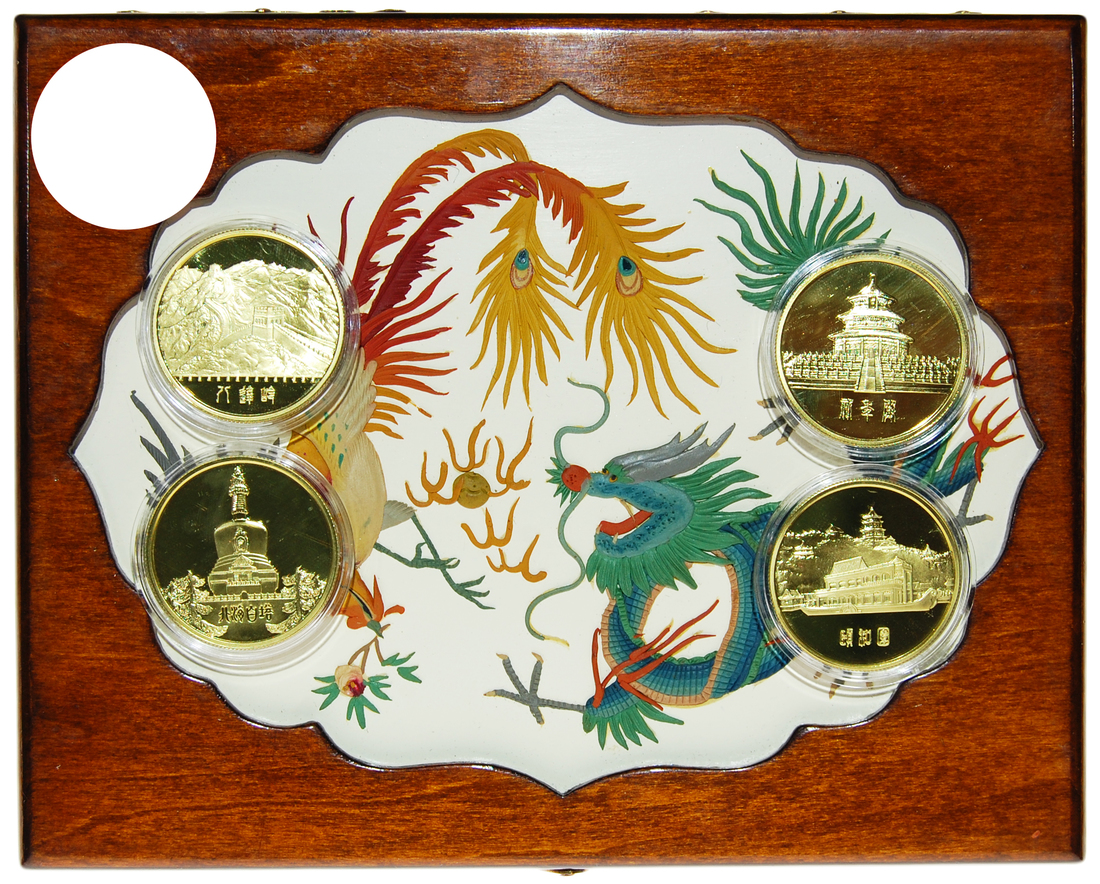 China, set of gold medals, 1979, depicting famous scenes around Beijing such as, The Great Wall, Bei Hai Tower, Temple of Heaven, Yi He Garden,