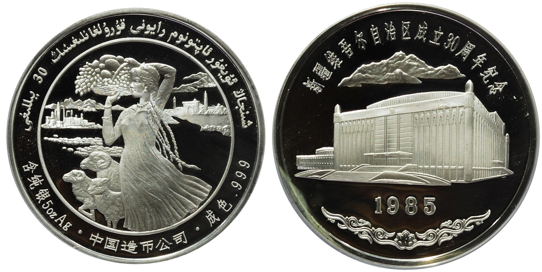 China, silve proof medal, 1985, struck to commemorate the 30th Anniversary of Xinjiang Autonomous Region, 5oz in weight,