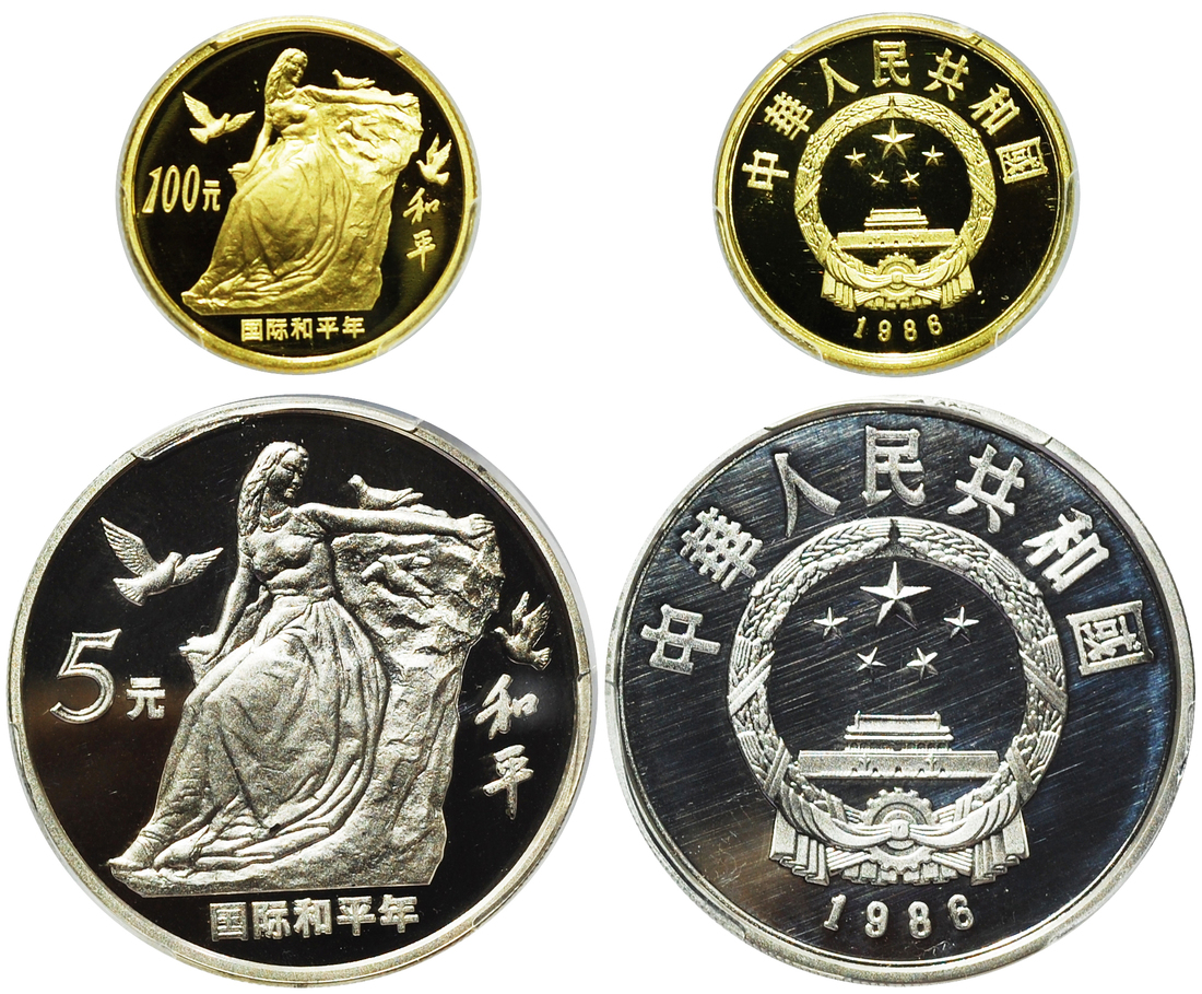 China, pair of silver proof 5yuan and gold proof 100yuan, 1986, 'Year of Peace',