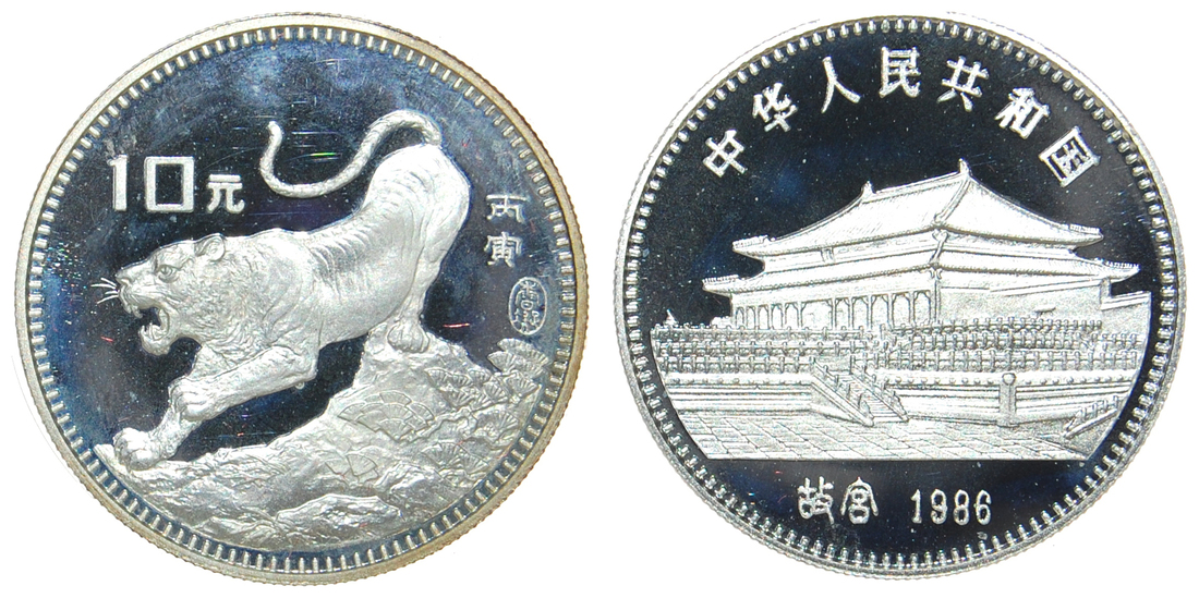 China, Silver 10 Yuan, 1986, Year of the Tiger, 15 grams in weight, certificate number 14734, proof, with certificate of authenticity and original box, mintage of 15,000 pieces