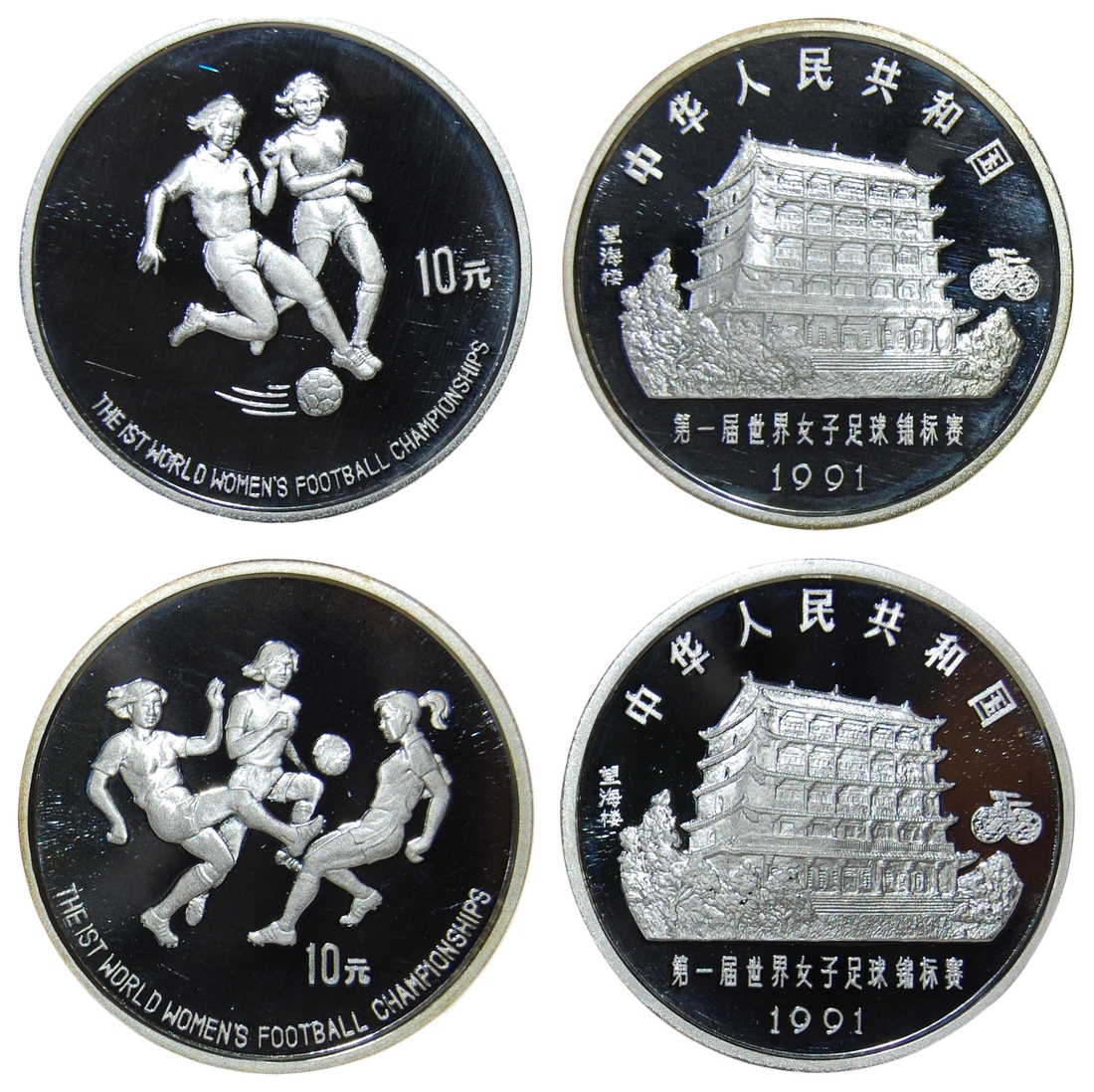 People's Republic of China, set of 2x Silver Prood 10yuan, 1991, the 1st World Women's Football Championships, each weighing 27grams,