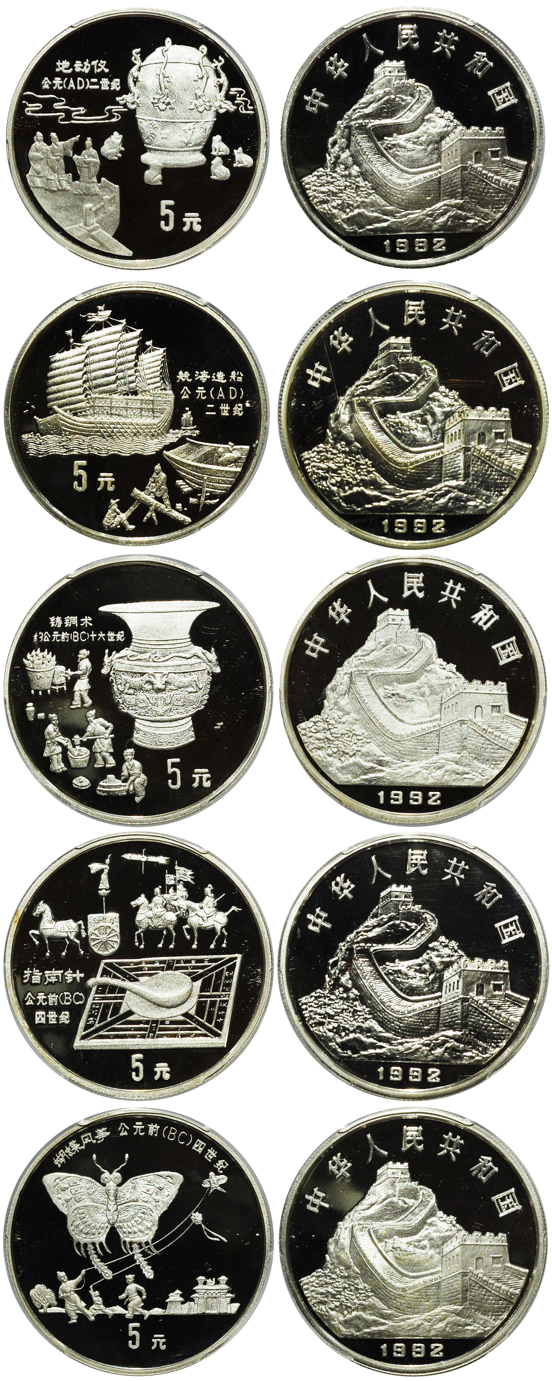 Ching, set of 5x Silver Proof 5yuan, 1992, Chinese Inventions, kite, seismograph, smelting, compass, ancient ships,