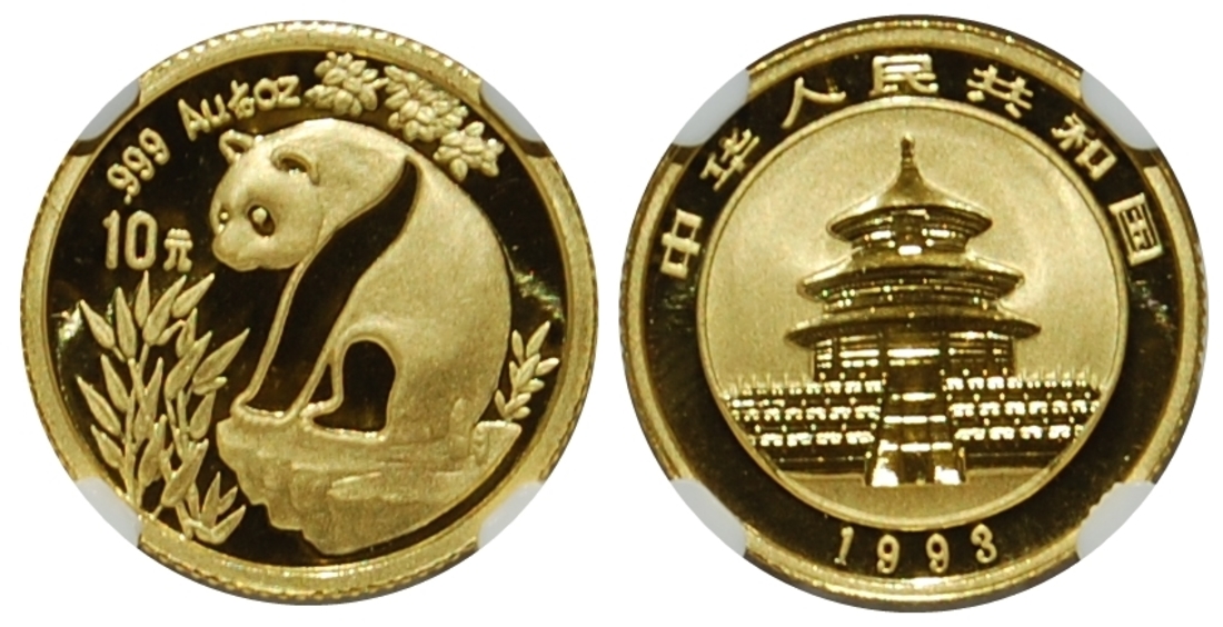 China, Gold 10 yuan, 1993, 'Panda', large date variety, Shanghai Mint, 0.0999 oz gold, NGC MS 70, only 14 graded at this mark according to NGC census.