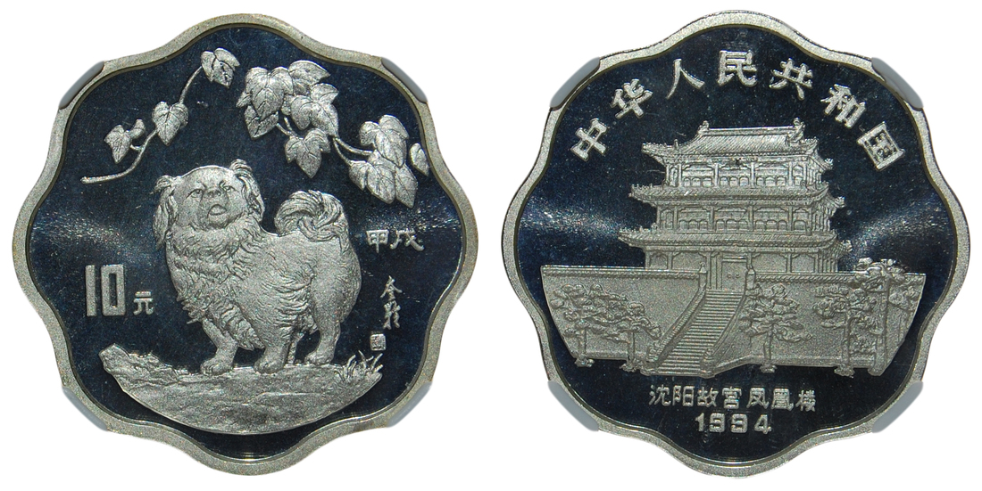 China, Silver 10 Yuan, 1994, Year of Dog, 2/3 oz Silver, flower shaped, proof, NGC holder PF 68 Ultra Cameo.