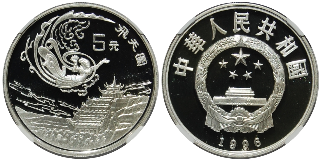 China, Silver 5 yuan, 1996, 'Silk Road', Dunhuang Paintings-Spirit Flying, series II, 0.6430 oz silver, mintage 15000, NGC PF 70.