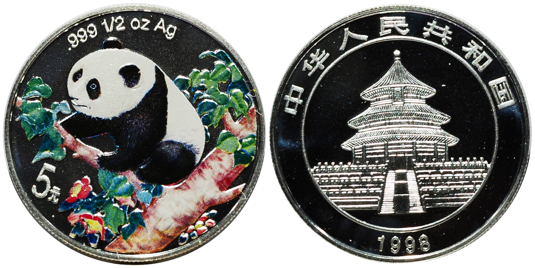 China, 5yuan, 1998, coloured panda, 1/2oz silver,