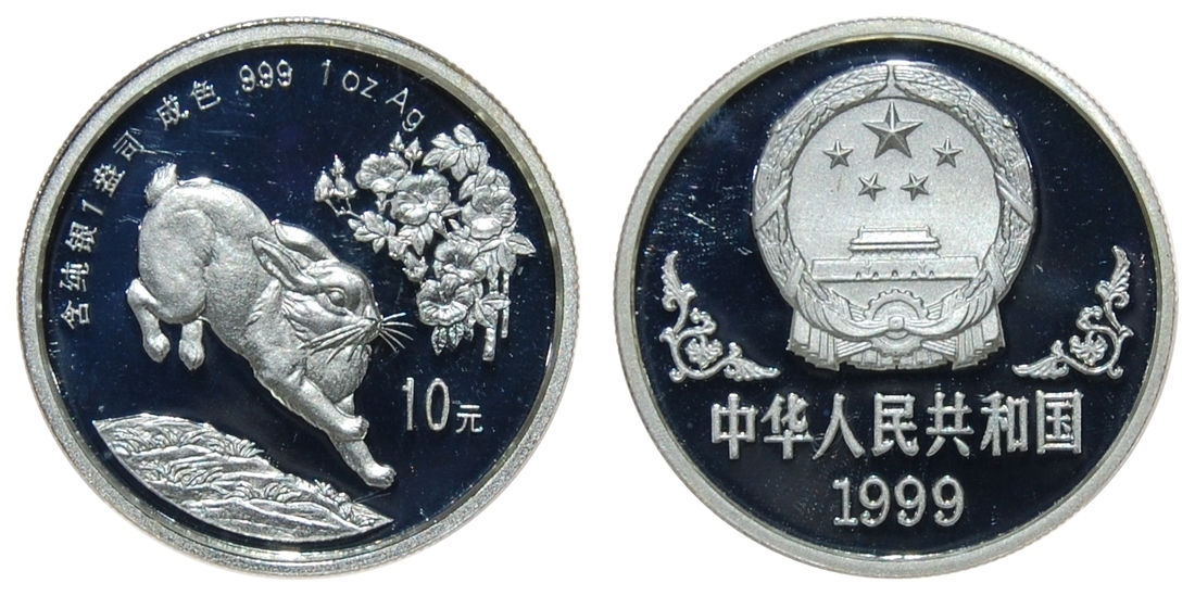 China, Silver 10 Yuan, 1999, Year of the Rabbit, 1 oz silver, proof,(KM 1225), PCGS holder PR69DCAM