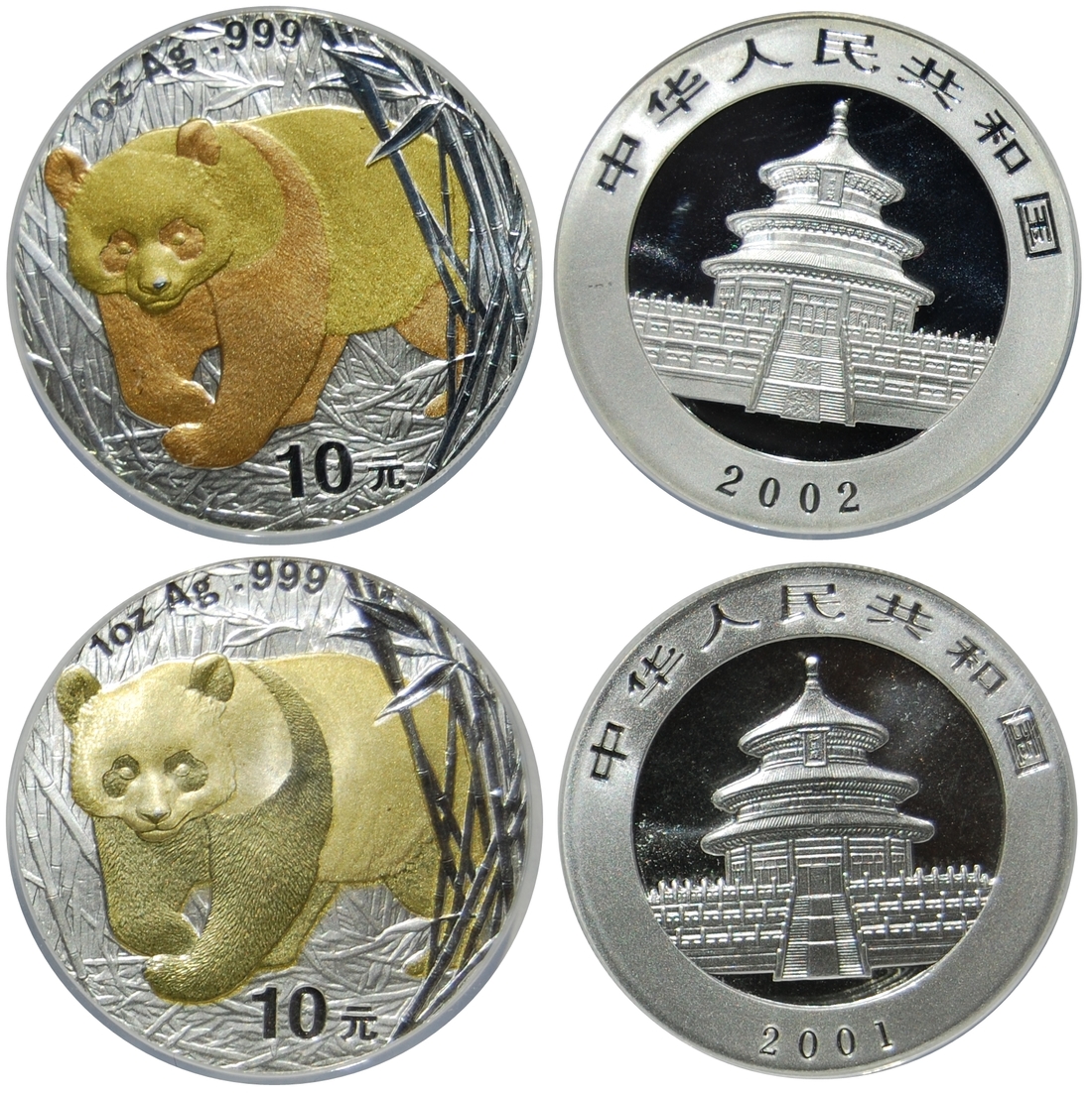 China, a pair of Silver 10 yuan Panda dollar, 2001 and 2002, multicolour,