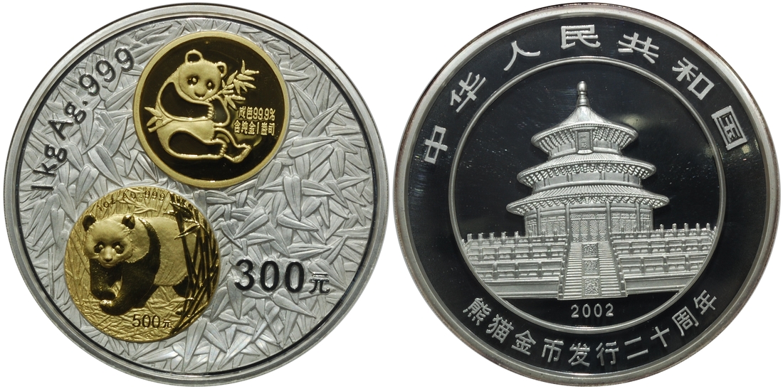 People's Republic of China, Gold and Silver 300yuan, 2002, struck to commemorate the 20th Anniversary of the Panda series, 1kilo of silver overlaid with gold, NGC PF69 ultra cameo