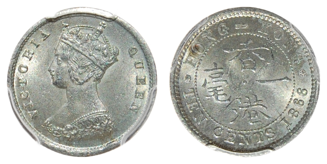 Hong Kong, Silver 10 cents, 1866, bust of Victoria on obverse, (KM 6.2), PCGS holder MS62.