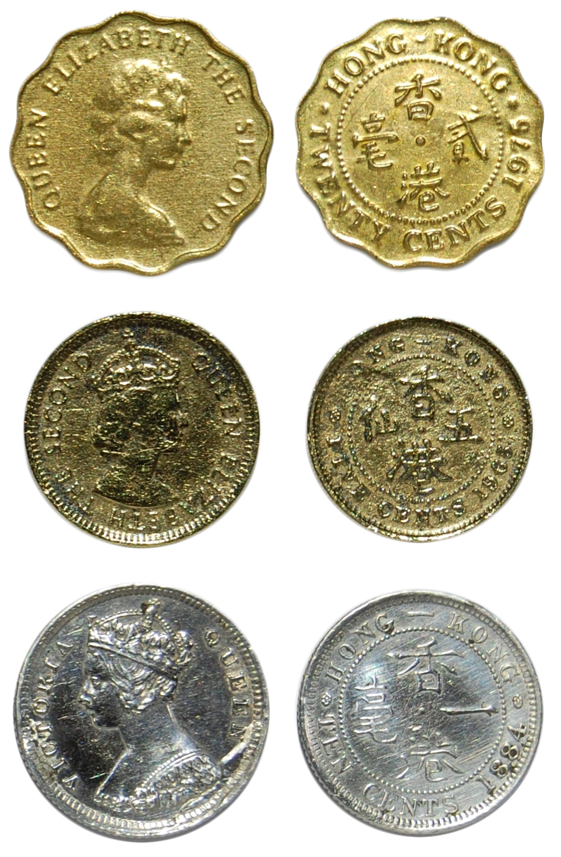 Hong Kong, group of 3 error coins, 10 cents 1884, impaired obverse, 5cents 1965 and 20cents 1975, both of which are imperfectly struck, (see photos),