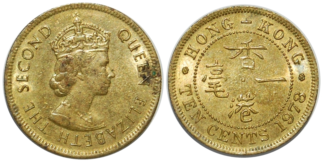 Hong Kong, brass 10cents, 1978, error coin in that the flan is much thinner than usual,