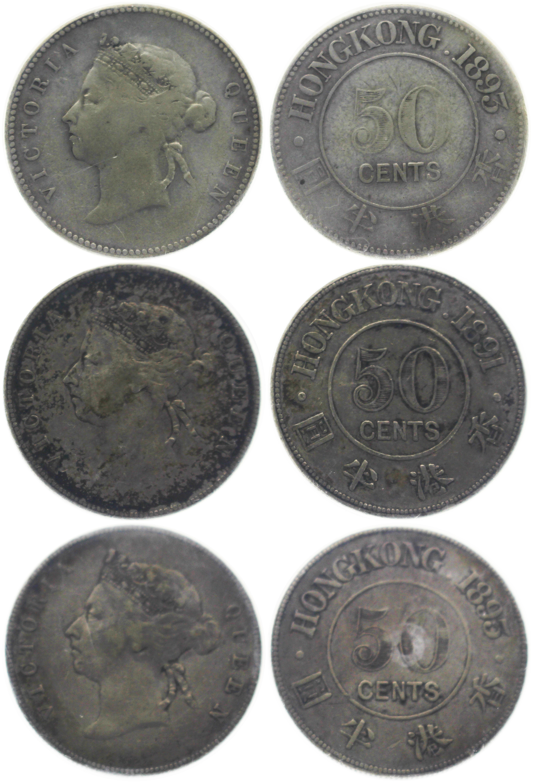 Hong Kong, lot of 3x Silver 50cents, 1891 and 1893 (2), Queen Victoria on obverse,