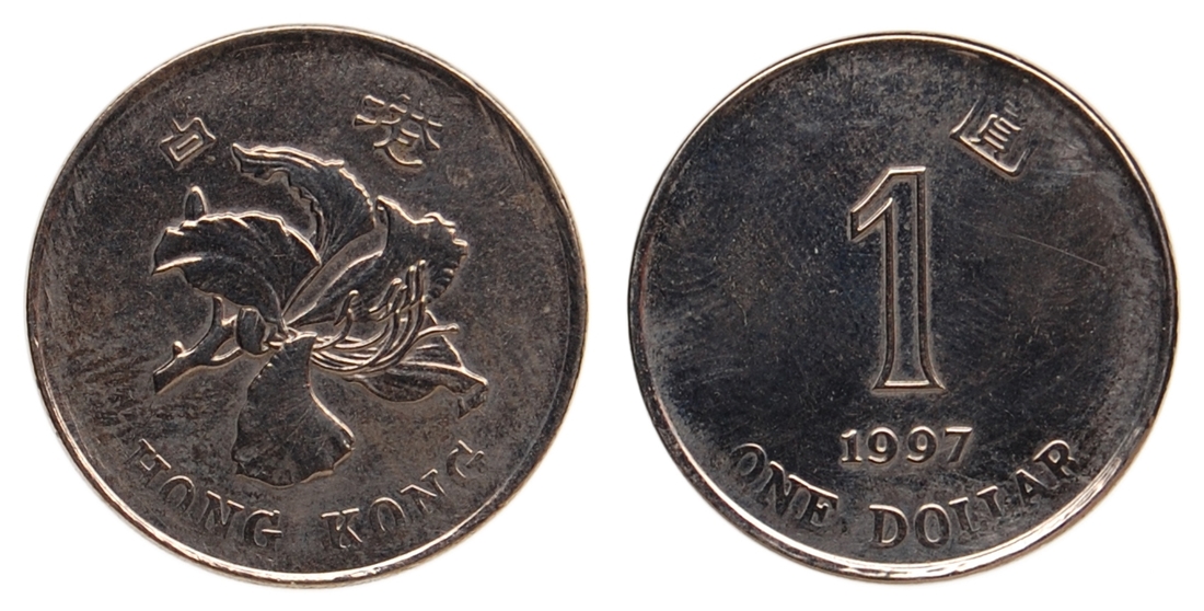 Hong Kong, $1, error coin, mistrike in that the Chinese character 'One' is missing, uncirculated and unusual.