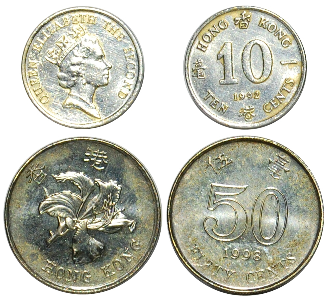 Hong Kong, error 10cents (1992) and 50cents (1998), both seem to be missing the brass component in its composition and therefore appear silver in colour rather than yellow,