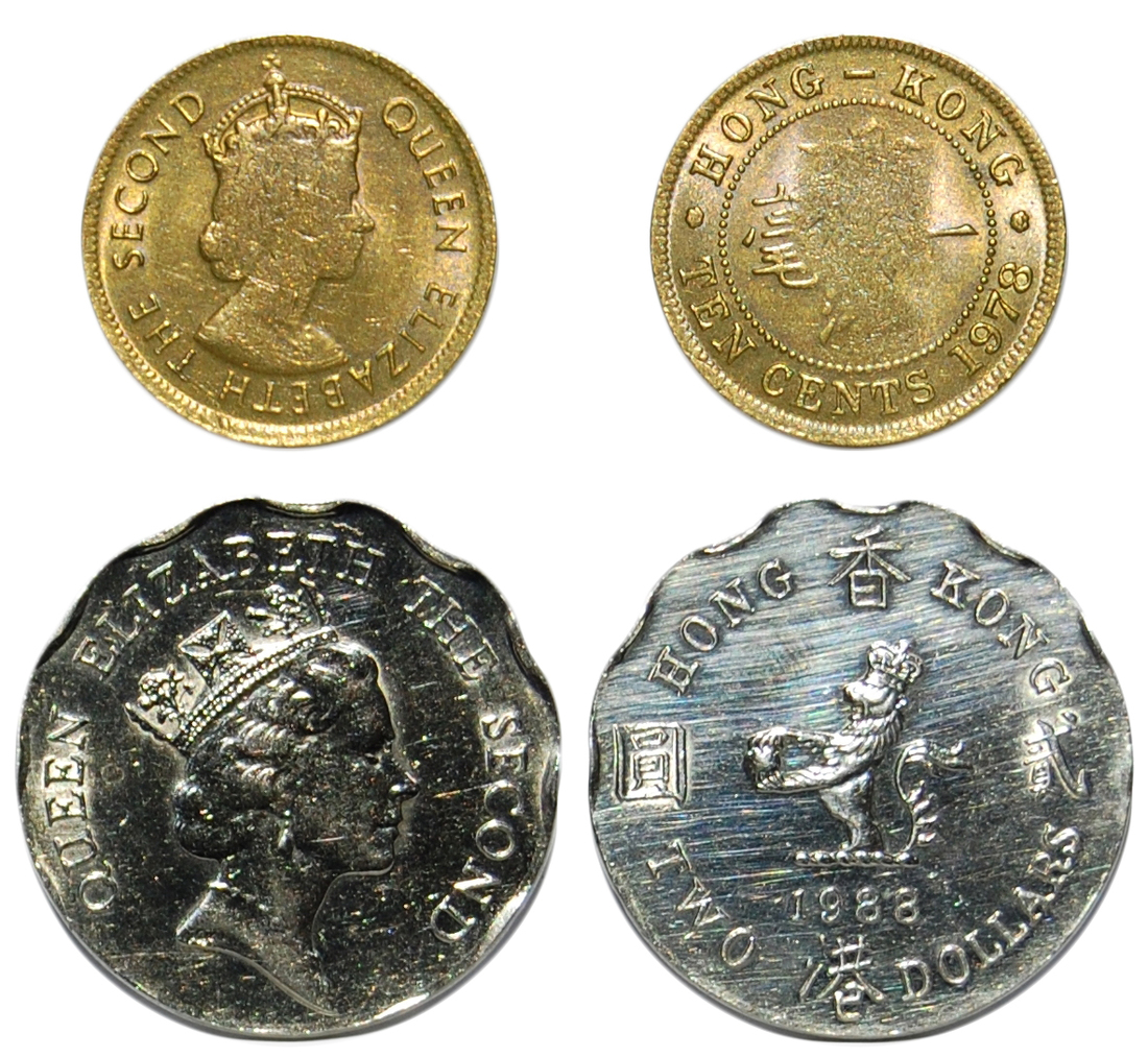Hong Kong, pair of error coins, 10cents 1978 and $2 1988, the 10cents has been very weakly struck in both the obverse and reverse such that the denomination and the Queen's profile appear very worn whilst the legends are still very sharply defined. The $2 has been imperfectly struck so that only the top half has traces of the scalloped edge while the bottom half is completely circular,