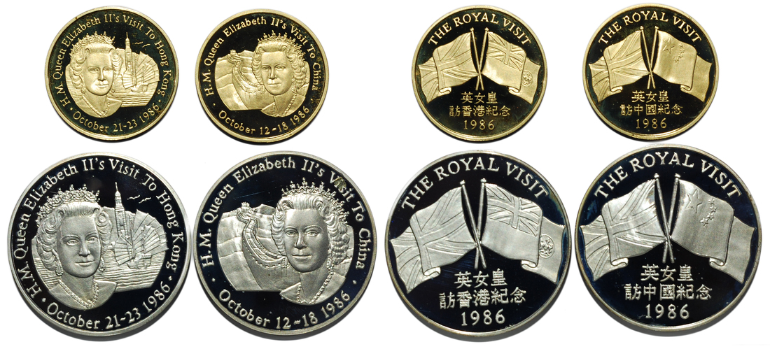 Hong Kong, one silver and one gold set of medals, 1986, struck to commemorate the Queen's visit to Hong Kong and China, each set containing two pieces, the gold medals each containing10grams of 22K gold,