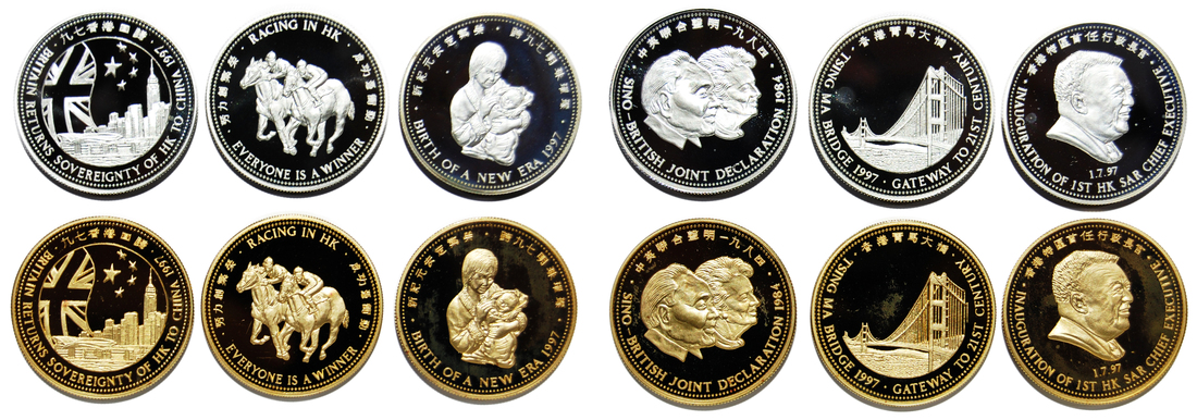 Hong Kong, a set of silver and a set of gold medallions, struck in 1997 by SPINK to commemorate the Handover, both sets with the same desgin, various scenes with the captions 'Everyone is a winner', 'Birth of a New Era' and 'Sino-British Joint Declaration 1984',