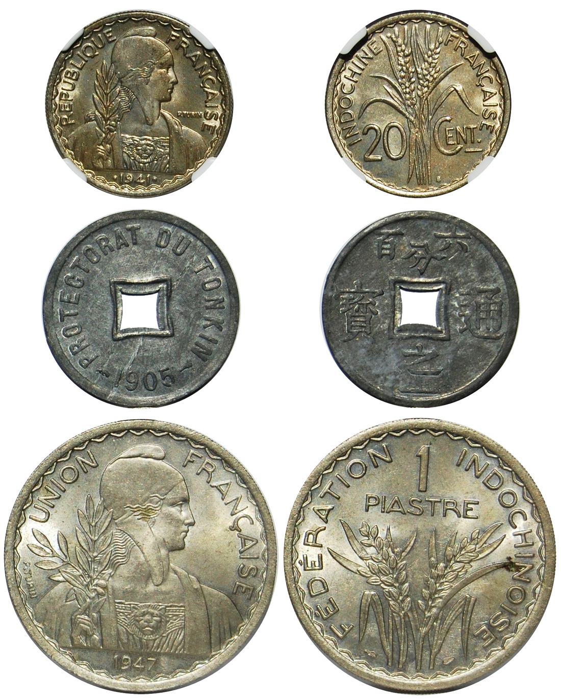 French Indo China, lot of 3 coins, 20cents 1941S, 1piastre 1947, Tonkin 1/600piastre, 1905