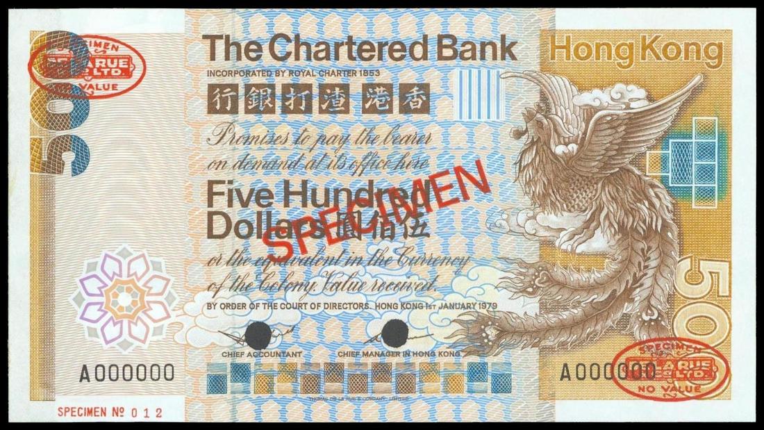 The Chartered Bank, $500, 'Speciemn', 1979, serial number A000000, brown and multicoloured, phoenix at right, watermark of a helmeted warrior at left, red De La Rue stamps, reverse brown, bank coat of arms and building,