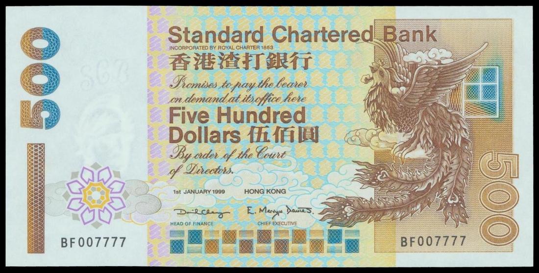 Standard Chartered Bank, $500, 1999, semi lucky number BF007777, brown and multicoloured, phoenix at right, bank coat of arms and building on reverse,