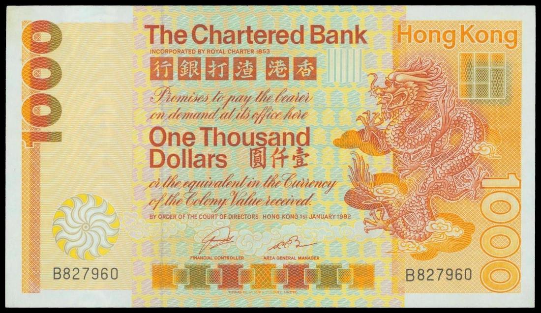 Chartered Bank, $1000, 1 January 1982, serial number B827960, orange on multicoloured underprint, dragon at right, reverse orange and pale green, arms at centre, bank building at left,