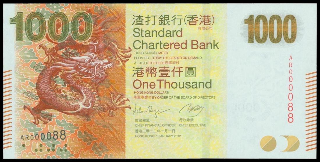 Standard Chartered Bank, $1000, 1 January 2012, low and lucky serial number AR000088, red-orange, yellow and multicolour, dragon at left, watermark of flower at right, reverse orange and multicolour, Chinese cash coin at centre,