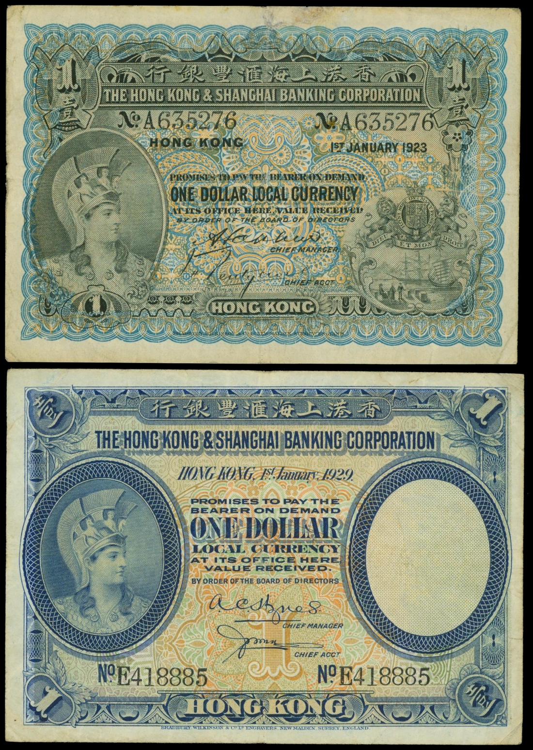 The HongKong and Shanghai Banking Corporation, pair of $1, 1923 and 1929, serial numbers A635276 and E418885, similar desgins, blue and multicoloured, helmeted head of Minerva at left, two printed signatures below, reverse purple, maiden centre,