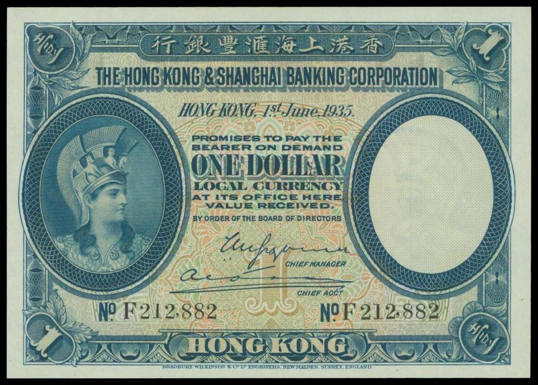 Hong Kong & Shanghai Banking Corporation, $1, 1935, serial number F 212882, blue on multicoloured underprint, Minerva at left, reverse purple, allegorical figure with torch at centre,
