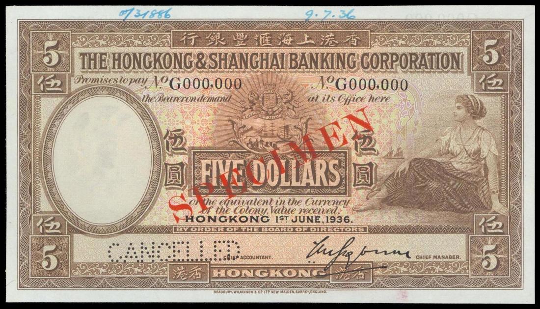 The HongKong and Shanghai Banking Corporation, $5, 'Specimen', 1936, brown and multicoloured, reclining maiden at right, coat of arms centrally and watermark of Minerva at left, reverse brown, old HSBC building at centre,