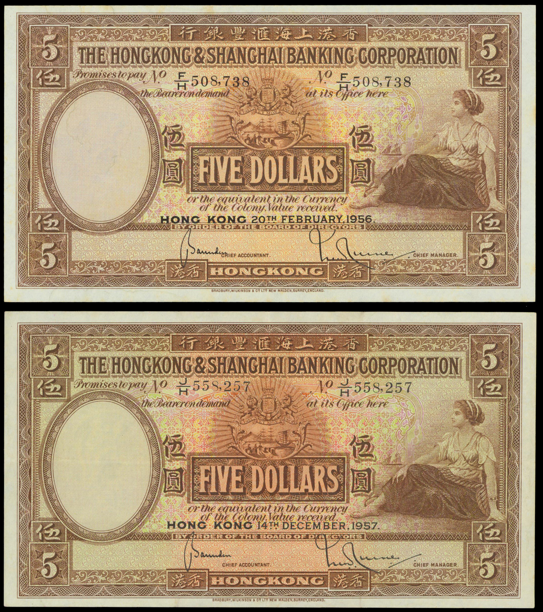 The HongKong and Shanghai Banking Corporation, pair of $5, 1956 and 1957, brown and multicoloured, reclining maiden at right, coat of arms at centre and watermark of Minerva at left, reverse brown, old HSBC building at centre,