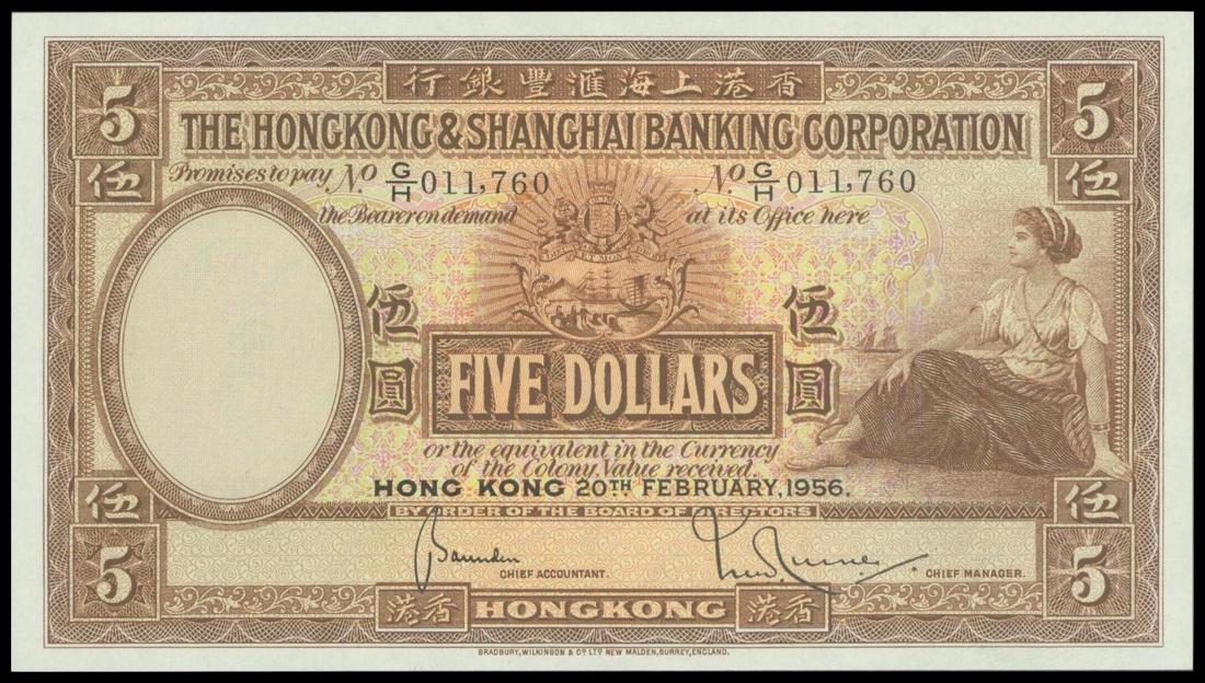 Hong Kong & Shanghai Banking Corporation, $5, 20 February 1956, serial number G/H 011760, brown, maiden at right, arms at centre, reverse brown on multicolour underprint, bank building at centre,